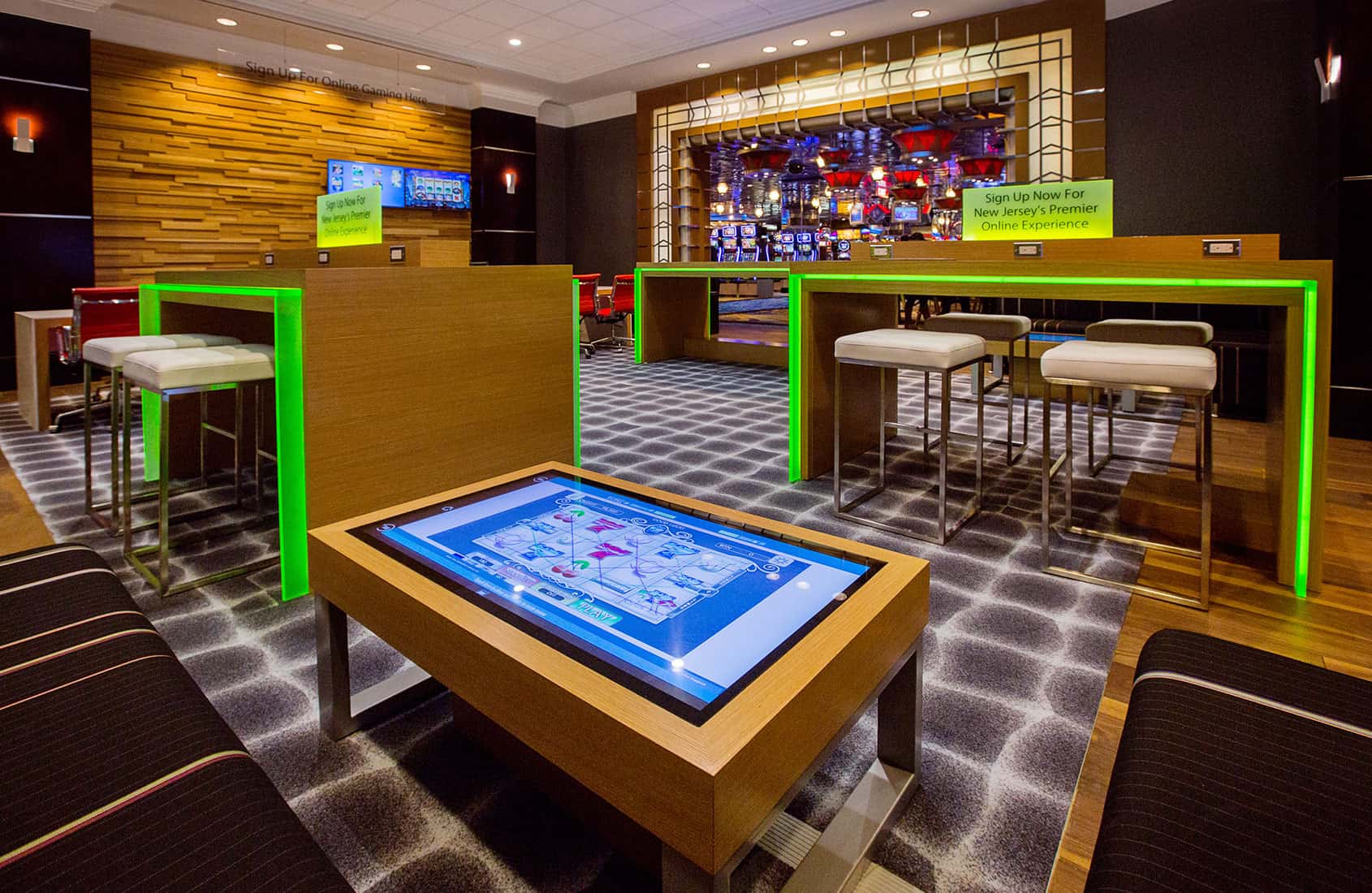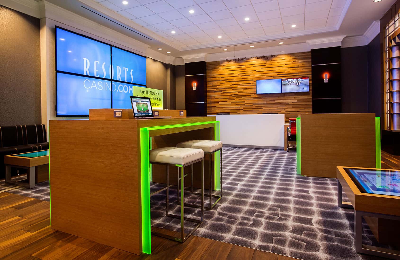 How does a brick-and-mortar casino introduce its players to a new online gaming experience? For Resorts Casino Hotel, the answer was an onsite Internet Gaming Lounge. For this project, SOSH transformed a former gaming tables area into an interactive social hub where customers can experience the exciting world of online gaming. In this staffed room, players can explore and interface with Resorts’ new online casino through an array of interactive touch screen displays, custom-made kiosks and their personal electronic devices. The approachable, contemporary space engages players with illuminated communal tables, custom banquette seating and a 160” video wall. Sleek metals, polished stone and a wooden floor with carpet inlay create a modern yet inviting space for this first-of-its-kind Internet Gaming Showcase.